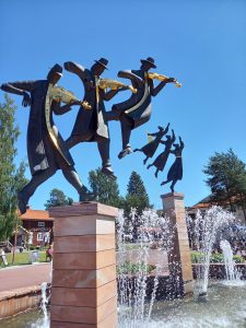 Die Sonne scheint, nur der Wind ist frisch. Zu den Figuren auf dem Brunnen: Man sagt, wenn man zwei Rättviker trifft, spielen drei davon Geige 🎻🙂.