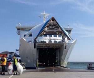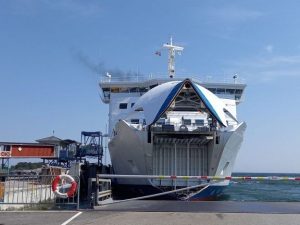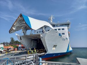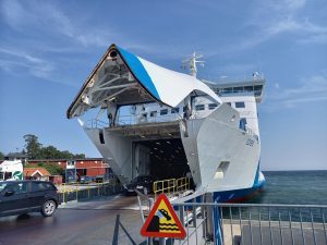 Und dann kommt die Fähre pünktlich um halb drei an. Sieht aus wie ein großer Haifisch, der sein Maul langsam aufmacht und erst Autos ausspuckt und dann neue verschlingt 🦈😁.