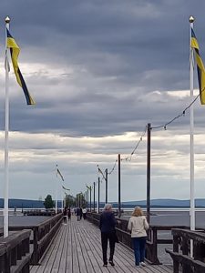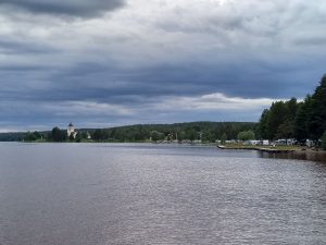 Daher fahren wir auch noch ein paar hundert Meter in die andere Richtung am Siljansee entlang zur vielleicht mit 628 m längsten Binnenseebrücke Europas. Sie führt zu einer künstlich angelegten Insel mit kleinem Hafen. Die Insel inkl. Holzbrücke wurden 1895 gebaut (und die Brücke 1992 total renoviert), da die Bucht sehr flach ist und dort dann Schiffe anlegen konnten.
