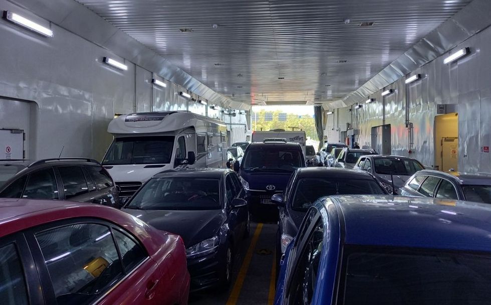 Und man glaubt es kaum: wir sind um viertel vor fünf an der Fähre, sie kam, legte an, die Autos fuhren ab und … nix 🤔. 20 Minuten Stillstand in der Schlange vor der Fähre. Um 17:10 Uhr tut sich was und die Autos dürfen drauf. Erklärung: die gesetzlich in Finnland vorgeschriebene Kaffeepause☕️🙃. Und die ist hier von 16:50 bis 17:10 Uhr. Stand auch an 😛.