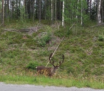 Und es gibt viele Elch- und Rentierwarnschilder. Nachdem wir wieder mal eines passiert haben …