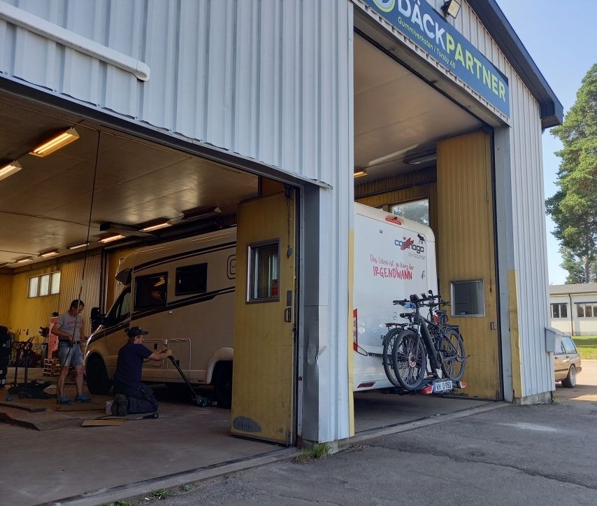 Und dann kommt die Gretchenfrage: Hat der gute Mann vielleicht sogar zwei neue Camper-Reifen (Schwerlastreifen) da oder kann welche besorgen? Es ist Freitag und wir haben uns schon darauf eingestellt, das Wochenende in Torsby zu verbringen.