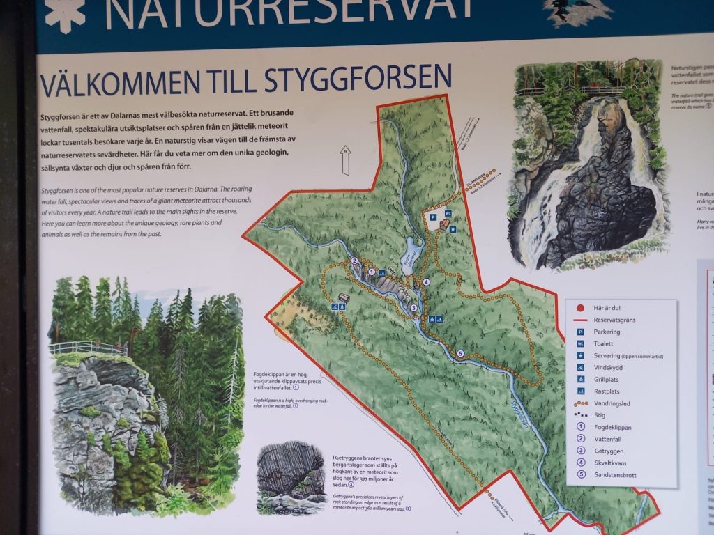 Erstes Ziel ist aber der Styggforsen, ein Wasserfall nahe der Ortschaft Boda in der schwedischen Gemeinde Rättvik in Dalarna. Die Fallhöhe des Wasserfalls beträgt 36 m. Der Wasserfall liegt in einem 12,32 ha großen Naturreservat. Am Unterlauf des Wasserfalls existieren interessante geologische Formationen, die sich aufgrund eines Meteoriteneinschlages am heutigen Siljan-See vor etwa 360 Millionen Jahren bildeten.